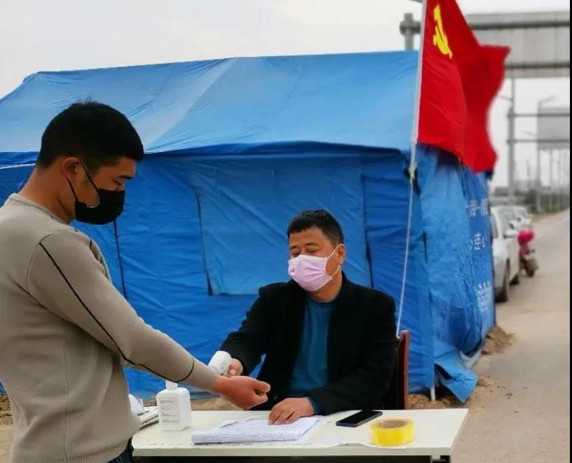 楼赵村处于渭南经开区与西安市临潼区交界处,车流量大,人员复杂,疫情防控任务艰巨。防控阻击战打响后,村干部郭红强连夜带领党员群众在8个卡口扎下帐篷,拉起一支由“两委”干部、民兵连和党员群众等50余人组成的“抗疫铁军”。在防控一线,他既是“指挥员”,又是“战斗员”,带头逐户排查建档,近距离接触疫区返乡人员,耐心劝导他们居家隔离,落实“一人一档”,每天为他们测量两次体温。